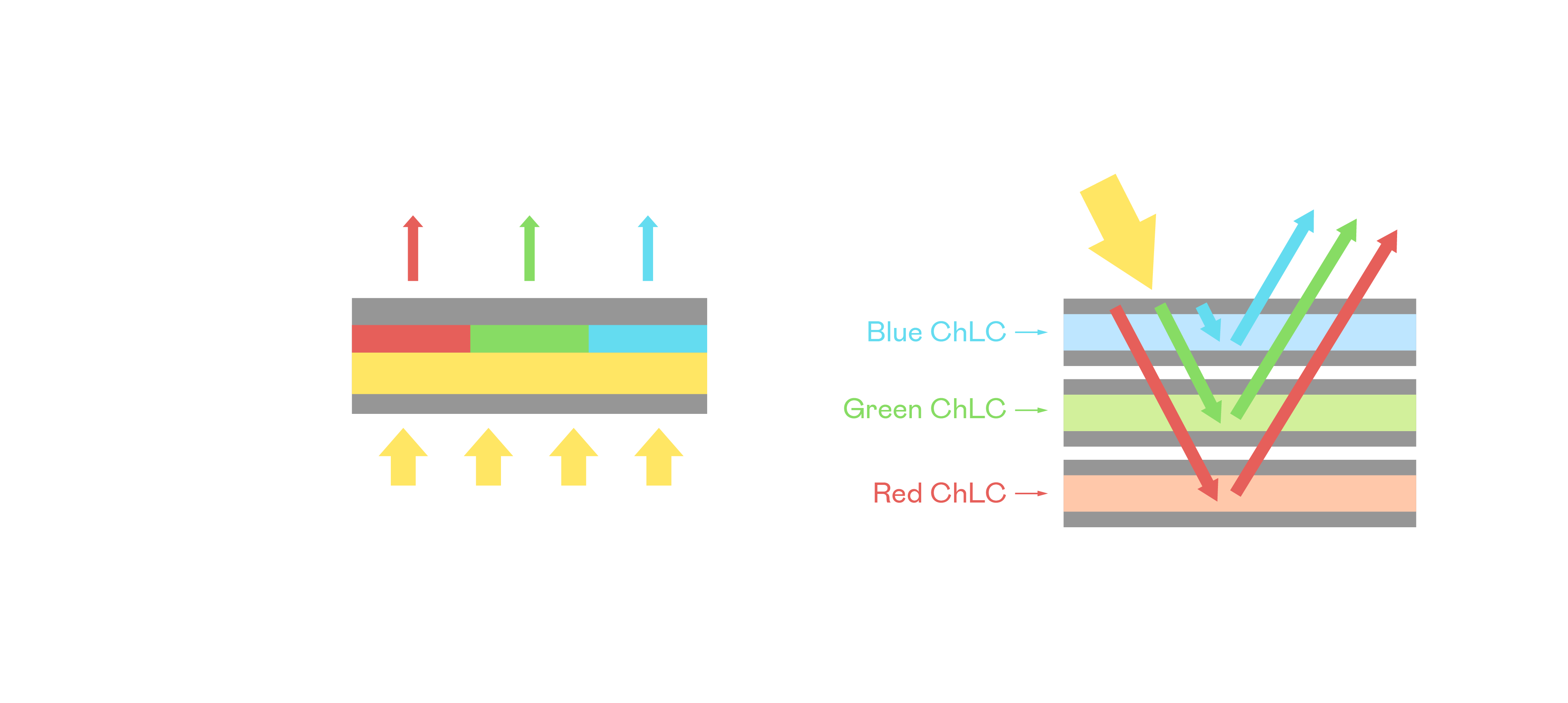 银娱优越会胆固醇液晶显示器是由红、绿、蓝三层胆固醇液晶面板堆叠而成,并采用无彩色滤光片设计,减少环境光在反射过程中的损耗。